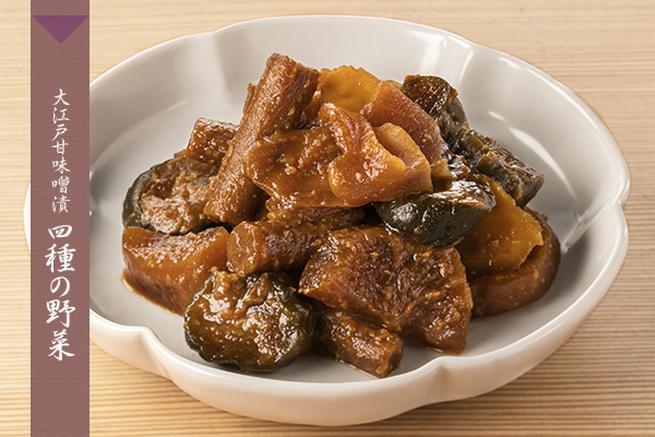 - 大江戸甘味噌漬 四種の野菜 120g、大江戸 福神漬 100g、茗荷たっぷり しば漬 100g